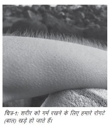 इसके विपरीत जब ठण्डे मौसम में आप गर्म कपड़ों के बगैर निकलते हैं, तो मस्तिष्क में तापमान केन्द्र (हाइपोथेलेमस) को उन प्रतिक्रियाओं को प्रारम्भ करना पड़ता है जो शरीर को गर्म रख सकें। ऐसी परिस्थितियों में आपके रोंगटे (बाल) खड़े हो जाते हैं जिससे हवा को बालों के बीच कैद करके, त्वचा की गर्मी को बाहर निकलने से बचाया जा सके। इसी प्रक्रिया में त्वचा में रक्त का प्रवाह भी कम हो जाता है। ठण्ड में काँपना भी मांसपेशियों द्वारा अधिक गर्मी पैदा कर शरीर के तापमान को बढ़ाने का एक तरीका है।