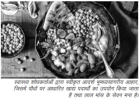 स्वास्थ्य शोधकर्ता आदर्श आहार के रूप में भूमध्यसागरीय (मेडिटेरेनियन) आहार को अच्छा बताते हैं। मेडिटेरेनियन आहार में मुख्यत: शाक-सब्ज़ियों, फल-फलियों और प्राकृतिक तेल आधारित खाद्य शामिल होते हैं; थोड़ी मात्रा में चिकन, अंडे, मछली वगैरह लिए जाते हैं, लेकिन लाल मांस (जैसे मटन, बीफ, पोर्क आदि) से परहेज़ किया जाता है। भूमध्यसागरीय क्षेत्रों में जो लोग इस तरह का आहार लेते हैं, वे लंबा और स्वस्थ जीवन जीते हैं।