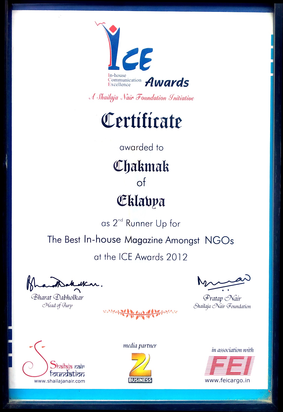 Chakmak - The Best In-house Magazine Amongst NGOs Awards - 2012 (2nd Runner up) - Onest Awards 2023- Eklavya Pitara