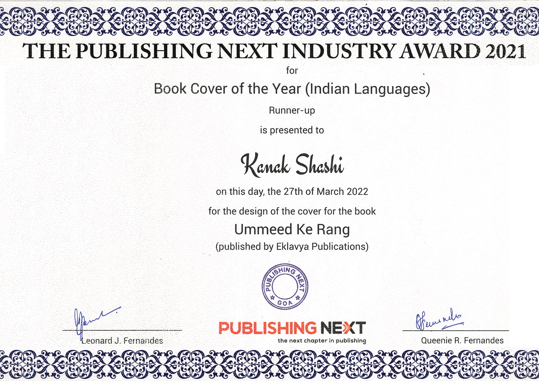 Ummid Ke Rang- Kanak Shahi- BOOK Cover of the year (Indian Languages) - 2021 (Runner-up)