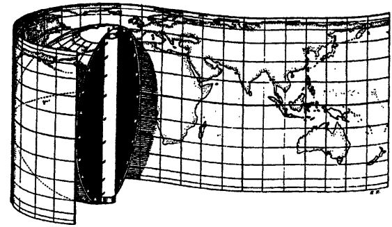 चित्र 5 : बेलनाकार प्रक्षेपण मैं देशांश रेखाएं समांतर बनाए जाते हैं। इस कारण ध्रुवों के पास आकृतियां पूरब और पश्चिम की ओर खिंच जाती हैं। इस बात पर गौर करें कि ग्लोब के अंदर की रोशनी एक बिंदु से नहीं बल्कि एक पूरी रेखा से निकलती है।