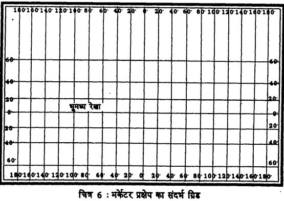 वास्तव में ग्लोब पर सभी अक्षांश रेखाओं के बीच की दूरी एक सी होती है। लेकिन जैसे-जैसे मर्केटर नक्शे में हम भूमध्य रेखा से ध्रुवों की तरफ बढ़ते हैं अक्षांशों के बीच की दूरी भी बढ़ती जाती है (चित्र 6)| इस प्रकार प्रत्येक भूखंड की लंबाई चौड़ाई का अनुपात वही रहा जैसी ग्लोब पर है। भूखंडों की आकृतियां भी सही बनीं लेकिन ध्रुवों के पास उनका आकार (साईज़) खुब बढ़ गया। केवल भूमध्य रेखा के पास नक्शा सही रहा।