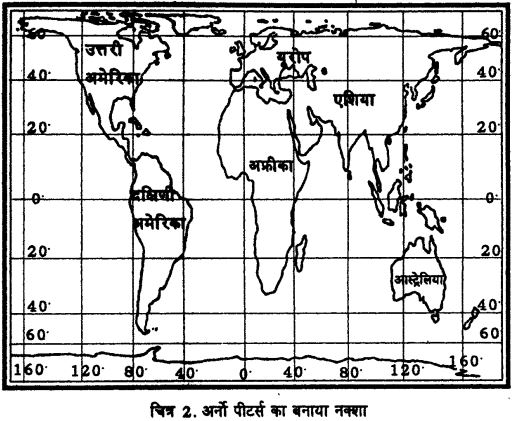 इस तरह मर्केटर जैसे नक्शे संसार की एक विकृत छवि छोड़ते हैं और इसके साथ-साथ उन विभिन्न देशों के लोगों के तुलनात्मक महत्व की एक खास धारणा भी बनाते हैं। हम मर्केटर के नक्शे के इतने आदी हो गए हैं कि दूसरे नक्शे चाहें वे ज्यादा सही हों, हमें सही नहीं लगते। उदाहरण के लिए 1973 में प्रस्तुत किया गया अर्नो पीटर्स का मानचित्र लें। (चित्र 2)