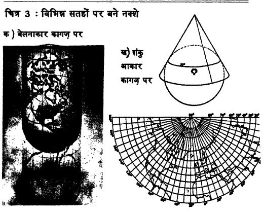 चाहे वह बेलन हो या शंकु हो या समतल, तीनों ग्लोब के किसी एक खास हिस्से को ही छूते हैं (देखिए चित्र 3)। उसी वृत्त पर वह नक्शा ग्लोब के अनुरूप बनेगा। उस वृत्त से दूर जाने पर नक्शे में विकृतियां बढ़ती जाएंगी। बेलन भूमध्य रेखा को छूता है तो इस प्रक्षेपण में भूमध्यरेखीय प्रदेश ही सही अनुपात में बनेंगे। ध्रुव के पास अधिक विकृति होगी। शंकु लगभग 40 डिग्री अक्षांश को छूता है तो वह हिस्सा ग्लोब के अनुरूप होगा। सपाट सतह पर बनाया नक्शा ध्रुव पर ग्लोब को छूता है। उसमें ध्रुवीय हिस्सा सही बन सकेगा।