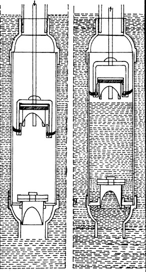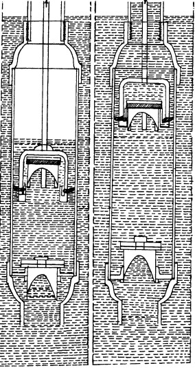 चित्र:2- हैंडपंप का हत्था पूरा नीचे करते हैं। अब कनेÏक्टग रॉड और उसकी वजह से सिलिंडर की पिस्टल ऊपर उठता है। इससे चैक वाल्व और पिस्टन के बीच जगह बढ़ जाने के कारण कम दबाव का क्षेत्र बनता है। अब सिलिंडर के अंदर की तुलना में बाहरी दबाव ज़्यादा होने के कारण पिस्टन वाल्व बंद हो जाता है और सिलिंडर में ऊपर से हवा नहीं आ पाती। लेकिन बोर का पानी सिलिंडर के नीचे लगे चैक वाल्व को आसानी से ऊपर ढकेलकर इस कम दबाव वाले हिस्से में घुस जाता है। इस स्थिति में चैक वाल्व खुला रहता है और पिस्टन वाल्व बंद।