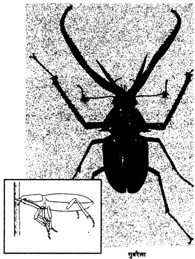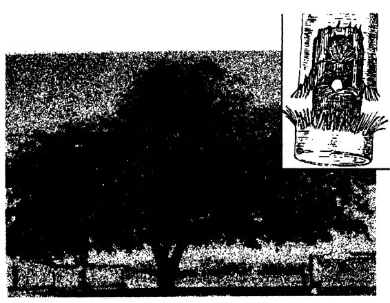 गुबरैला, शिरीष और अंडे की झिर्री: शिरीष का पेड; (इनसेट) ऑन्सीडेरेस प्रजाति का गुबरैला कुछ इस तरह शाखा में एक झिर्री काटकर उसमें अंडा देती है।