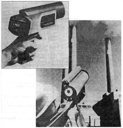 इंफ्रारेड पायरोमीटर (ऊपर इंसेट में); उसका एक प्रयोग (नीचे): सभी गर्म वस्तुएं इंफ्रारेड (अवरक्त) प्रकाश छोड़ती हैं। इस पायरोमीटर में इसी गुण का उपयोग किया जाता है। इसकी सहायता से वस्तुओं से निकल रहे इंफ्ररेड विकिरण को नाप कर वस्तु का ताप पता किया जाता है।