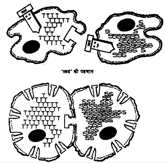 स्वयं की पहचान: चाहे वो गुर्दे की कोशिकाएं हों, दिल की या जिगर की - उन सबकी एक खास पहचान होती है ( स्वयं ) जिसके आधार पर एक विशेष किस्म की श्वेत रक्त कोशिकाएं (टीलिम्फोसाइट्स ) उन्हें पहचान लेती हैं। खुद श्वेत रक्त कोशिकाओं पर भी वही पहचान मौजूद रहती है जिससे एक श्वेत रक्त कोशिका अन्य श्वेत रक्त कोशिकाओं को भी स्वयं' के रूप में पहचान पाती हैं। चित्र में श्वेत रक्त कोशिकाओं पर T-नुमा ग्राही दिखाए गए हैं। जिसमें स्वयं फंस जाएगा और श्वेत रक्त कोशिका को खबर लग जाएगी कि यह ‘स्वयं' ही है, गैर नहीं।