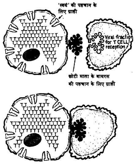 अन्य की पहचानः श्वेत रक्त कोशिकाओं पर जैसे स्वयं की पहचान के लिए ग्राही होते हैं वैसे ही 'गैर' का पता लगाने के लिए भी विशेष ग्राही होते हैं। चित्र में एक ऐसी श्वेत रक्त कोशिका दिखाई गई है जिसका ग्राही केवल छोटी-माता के वायरस को पहचानने के लिए बना है।