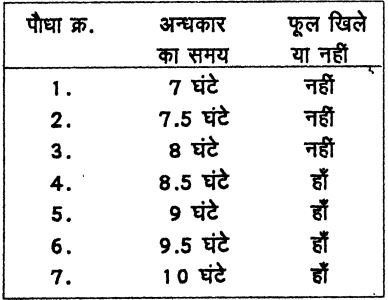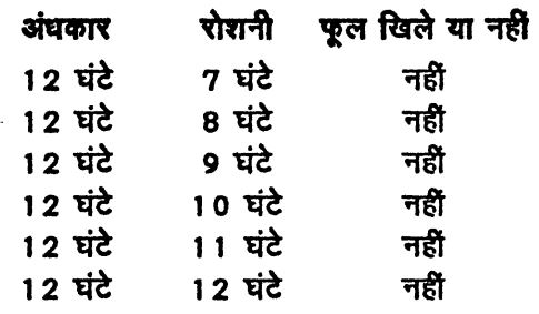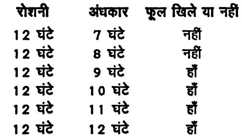 होने दिया जाए, तो भी फूल आ जाते। हैं। यदि एक पौधे को लगातार प्रकाश में रखा जाए लेकिन उसकी एक ही। पत्ती को बदलते अंधकार चक्र को महसूस करने दें तो भी पौधे पर फूल आ जाते हैं। इसका मतलब प्रकाश व अन्धकार के समय का अहसास पौधे के पत्तों को होता है।