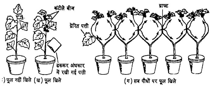 धतूरे के पौधे के साथ हुए प्रयोग: (क) लगातार प्रकाश में रखा धतूरे का पौधा (ब) एक पत्ती को अंधकार में रखने पर (ग) उस प्रेरित पत्ती को प्रेरित पौधे पर ग्राफ्ट करने तथा चार और पौधों को ग्राफ्टिंग से एक दूसरे से जोड़ने पर।