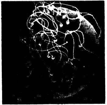 चित्रः 4. अंडाणु का फोटोः एक समुद्री जीव का अंडाणु। उसकी ओर आकर्षित कई शुक्राणु। इनमें से कोई एक ही अंडाणु को निषेचित करेगा।