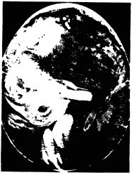 भ्रूण से जीव तक : मुर्गी के अंडे के अंदर चूज़े के विकास की विभिन्न अवस्थाएं - 1.15 दिन बाद अंडे के अंदर की स्थिति। आंखे लगभग पूरी बन चुकी हैं। चोंच इतनी विकसित हो चुकी है कि खुल और बंद हो सकती है। 2.17 दिन बाद - चूज़े का विकास लगभग पूरा हो चुका है। वह सांस लेने के लिए चोंच खोल और बंद कर सकता है, अंडे के बाहर से उसकी सांस लेने की आवाज़ सुनी जा सकती है। 3. 21 दिन बाद - चूज़े ने चोंच से अंडे का बाहरी खोल तोड़ दिया है। इसके बाद भी ज़रूरी नहीं कि चूज़ा तुरंत बाहर निकल आएगा, उसे इसमें एक घंटे से लेकर दो दिन का समय तक लग सकता है।
