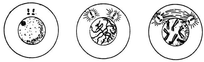 1. कोशिका के केंद्रक के अंदर गुमसूत्र गट्ठर के रूप में मौजूद। इस स्थिति में ने अलग-अलग नहीं दिखते। केंद्रक के बाहर कोशिका द्रव में एक दूसरे के पास-पास दो छोटी-छोटी नलाकार रचनाएं - जिन्हें सेंट्रिओल कहते हैं।