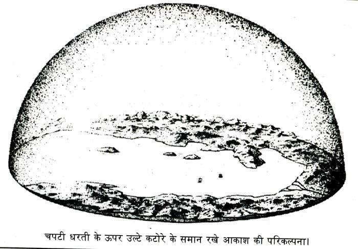 पुराने ज़माने में भी लोग यही मानते थे कि धरती सपाट है, चपटी है। ऊपर ही ओर नज़र उठा कर देखो तो हहर कहीं आकाश-ही-आकाश है। दिन में नीला और रात में तारों से भरा काला-सा। अगर किसी खुली जगह पर जाकर चारों ओर दूर-दूर तक नज़र दौड़ाओ तो लगता है कि कहीं दूर हर कोने पर पृथ्वी और आकाश मिल रहे हों। मानो किसी ने चपटी धरती पर एक बड़ा-सा कटोरा उल्टा करके रख दिया हो।