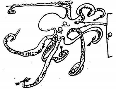 यह कहते हुए उन्होंने अपने कानों को थपथपाया - लगा जैसे ताली बज रही हो। कोने में तांबे का जो बड़ा-सा बर्तन रखा था उसमें से कुछ निकला। मुझे लगा कि एक बड़ा-सा सांप है। लेकिन जब गौर किया तो उसके एक तरफ छोटे-छोटे चूसक थे -- तो यह ऑक्टोपस की एक भुजा थी। इस भुजा ने एक अलमारी खोली और एक बड़ा सा तौलिया निकाला, अब तक उसकी दूसरी भुजा भी बाहर आ चुकी थी जिसे उसने तौलिए से पोंछा। अब सूखी भुजा चूसकों की मदद से दीवार पर चिपक गई, और धीरे-धीरे पूरा जानवर बाहर आ गया। उसने अपने को सुखाया और दीवार पर रेंगने लगा।