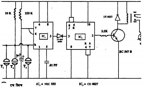 नोटः रिले की कॉयल (Coil) पर 9v D.C. करंट दिया जाता है। यह ट्रांजिस्टर BC547 B से नियंत्रित होता है। आऊटपुट के लिए अलग से 220 वोल्ट A.C. सप्लाई ली जाती है। दो सुचालक पट्टियों से बनाए गए टच स्विच (T) से रिले नियंत्रित होगी। ऐसे जितने भी टच स्विच लगाएंगे उन सब जगहों से आप बल्ब नियंत्रित कर सकते हैं।