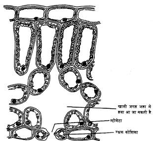 ऊपर : एक पत्‍ती की काट जिसमें नीचे की तरु स्‍टोमेटा यानी रक्षक कोशिकाएं और खाली जगह दिख रही है।