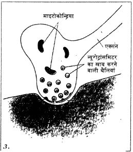 1.  तंत्रिका तंत्र की एक कोशिका अर्थात न्‍यूरॉन जिसमें ऊपर के डेंड्राइट जानकारी इकट्ठी करते हैं, बीच का लम्‍बा तारनुमा हिस्‍सा यानी एक्सन उसे नीचे के दूसरे छोर तक ले जाता है जहां यह संदेश दूसरे न्‍यूरॉन या किसी अन्‍य कोशिका तक पहुंचता है।