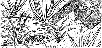 मेंढक का जीवन चक्र बरसात के मौसम में मेंढक के अंडो के समूह डबरों में तैरते हुए मिलते हैं। ऐसे ही एक डबरे को चित्र में दिखाया गया है। इस चित्र में अंडे लगभग उतने ही बड़े दिखाए गए हैं जितने बड़े वे वास्तव में होते हैं।