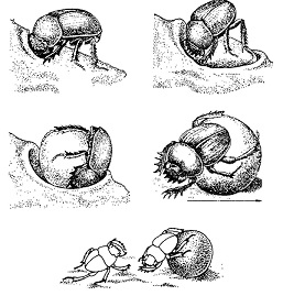 लुढ़कता गोला: 1. गोबर से एक गोल टुकड़ा काटता गुबरैला (पहले के तीन रेखाचित्र) 2. गोले को लुढ़का कर ले जाता गुबरैला; तीर का आकार गोले को लुढ़काने की दिशा बताता है। 3. गोले को लुढ़काने के काम में लगे नर और मादा। 4. इस चरण में गोले को गड्ढे के अंदर लुढ़का दिया गया है।