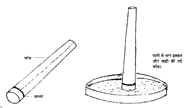 चित्र: स्याही के मिश्रण का एक छल्ला चॉक पर बनाकर उसे किसी पानी से भरे ढक्कन या प्लेट में खड़ा करना है। ध्यान रहे कि चॉक पर बना छल्ला पानी में डूबना नहीं चाहिए।
