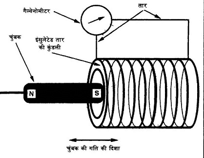 ![]() चुंबकीय-विद्युतीय प्रेरण को दर्शाने के लिए फैराडे ने इस उपकरण का उपयोग कियाः इसमें तार की एक कुंडली में एक चुंबक अंदर बाहर होता है - इस कुंडली से एक गैल्वेनोमीटर जुड़ा हुआ है; चुंबक की इस गति से कुंडली में विद्युत धारा पैदा होती है। |