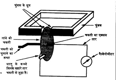 ![]() फैराडे का डायनमोः इसमें हाथ की सहायता से तांबे की एक चकती को एक शक्तिशाली चुंबक के ध्रुवों के बीच घुमाया जाता है। इस प्रक्रिया से इसमें विद्युत की लगातार धारा पैदा होती है। |