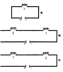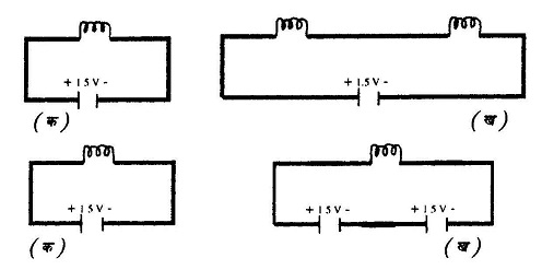 1. परिपथ-क में लगे हुए बल्ब से पहले एक और बल्ब (जैसे परिपथ-ख में) जोड़ दिया जाता है। क्या अब बल्ब क्रमांक-1 पहले की तुलना में