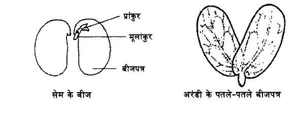 द्विबीजपत्र बीज के दो उदाहरण: सेम के बीज को खोलने पर बीजपत्र के साथ जुड़ा हुआ अंकुर दिखाई दे रहा है। जिस हिस्से से जड़ बनेगी उसे मूलांकुर कहते हैं। और जिससे तना बनेगा उसे प्रांकुर; मूलांकुर और प्रांकुर को मिलाकर अंकुर कहते हैं। और अंकुर व बीजपत्र मिलकर भ्रूण (Embryo) कहलाते हैं। सेम के बीजपत्र अंकुर की तुलना में काफी बड़े व पोषक पदार्थों से युक्त होते हैं। चना, सेम, मूंग, तूअर जैसे बीजों में पौधे को शुरुआती विकास के लिए भोजन बीजपत्र में मौजूद पोषक पदार्थों से ही प्राप्त होता है, जब तक कि पौधा अपना भोजन खुद न बनाना शुरू कर दे।