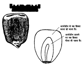 मक्के के बीज की काट: मक्के के पानी में भिगोए बीज को चित्रानुसार जमाकर किसी ब्लेड की मदद से खड़ी काट लेनी है। इसके बाद इस कोट पर आयोडीन के हल्के घोल की दो-तीन बूंदें डालकर थोड़ी देर इंतज़ार कीजिए। जिस भाग का रंग काला हो जाता है वह भ्रूणपोष है और जिस हिस्से का रंग पीला ही रहता है वह भ्रूण है।