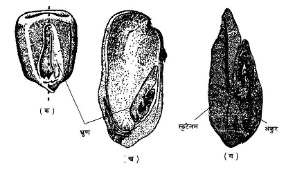 (ग) बीच वाले चित्र के भ्रूण वाले हिस्से को बड़ा करके देखने पर; दाहिनी ओर अंकुर है और बाईं ओर स्कूटेलम जिसे कुछ लोग बीजपत्र भी कहते हैं। स्कूटेलम अंकुर को चारों ओर से घेरे रहता है और उसका काम है भ्रूणपोष से पोषक पदार्थ लेकर अंकुर तक पहुंचाना।