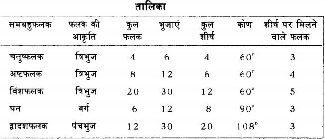 चित्र-4 में पांच सम-बहुफलकीय आकृतियों को दर्शाया गया है। इनके नाम प्रत्येक आकृति में फलकों की संख्या के अनुसार रखे जाते हैं