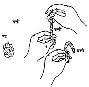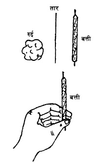 प्रश्न: क्या, बत्ती खड़ी है या मुड़ गई? अब एक तार का टुकड़ा या काड़ी लो। उस पर रुई लपेट कर फिर से बत्ती बनाओ। तार या काड़ी का एक सिरा पकड़कर बत्ती को खड़ी करो।