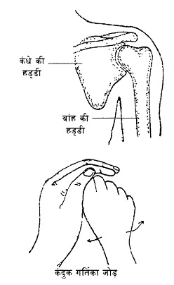 अपने एक हाथ के पंजे को नाग के फन की तरह बनाओ। हथेली और अंगुलियों से बने गड्ढे में दूसरे हाथ की मुट्ठी बंद करके रखो। चित्र में बताए अनुसार मुट्ठी को चारों ओर घुमाओ। ठीक इसी तरह तुम्हारे कंधे की हड्डी में बने गड्ढे में बांह की हड्डी घूमती है। तुम्हारी जांघ की हड्डी और कूल्हे की हड्डी का जोड़ भी इसी तरह का है।