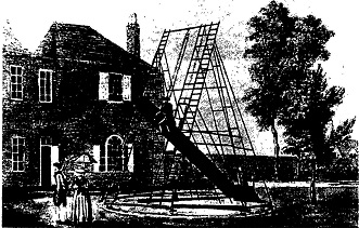 विलियम हर्शेल की दूरबीन: यूरेनस की खोज करने वाले विलियम हर्शेल (1738-- 1822) की विंडसर स्थित जागीर में बनाए गए बीस फीट लंबे टेलिस्कोप का एक दुर्लभ दृश्य। इस टेलिस्कोप से आकाश दर्शन करना काफी जोखिम भरा था क्योंकि इस टेलिस्कोप से चांद-तारे देखने के लिए बीस फीट की ऊंचाई पर नली के अगले सिरे के पास चढ़कर बैठना होता था। पूरी व्यवस्था इस तरह बनाई गई थी कि न सिर्फ इस नली को ऊपर-नीचे किया जा सकता था बल्कि उसे चारों ओर घुमाया भी जा सकता था।