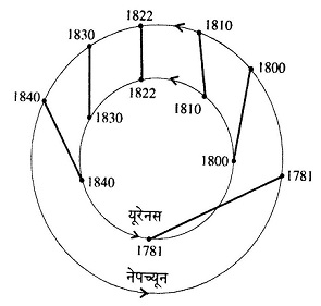 सापेक्षिक स्थितियां: 1781 से 1840 की बीच यूरेनस और नेपच्यून की सापेक्षिक स्थितियों में आए बदलावों को यहां दिखाने की कोशिश की गई है। 1822 के पहले नेपच्यून अपनी कक्षा में यूरेनस से आगे चल रहा था और यूरेनस को खींच रहा था। जिसमे यूरेनम अपनी कक्षा में भटकन दिखा रहा था। 1822 में दोनों ग्रह युग्म बना रहे थे। इस समय यूरेनस ठीक अपनी कक्षा में रहता है। 1822 के बाद यूरेनस अपनी कक्षा में नेपच्यून से आगे चल रहा है। एक बार फिर नेपच्यून यूरेनस को खींचता है जिसकी वजह से यूरेनस फिर भटकने लगता है।