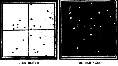 यूं पलटी नेपच्यून की किस्मतः 1816 में बर्लिन ऑबज़रवेट्री के जे. जी. गाले और हेनरिक डी अरेस्ट के पास यही मानचित्र उपलब्ध था जिसमें मकर राशि के तारों की जानकारी दर्शाई गई थी। इन दोनों ने एक-एक तारे की आसमानी स्थिति और मानचित्र में दिए विवरण में मिलान किया। दाहिनी ओर के मानचित्र को ध्यान से देखिए, इसमें तीर बनाकर नेपच्यून को दिखाया गया है। इसी मानचित्र में एक धन का चिन्ह भी दिखाई दे रहा है। लेवेरियर ने यहां नेपच्यून के होने की संभावना व्यक्त की थी। कागज़ी पूर्वानुमान और आसमानी स्थिति में सिर्फ एक डिग्री का अंतर था।