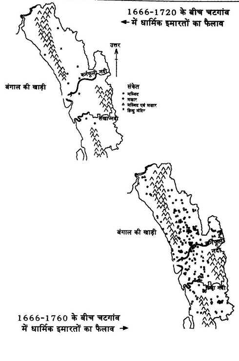 साथ दिए गए मानचित्रों से यह पता चलता है कि चटगांव शहर के पास मस्जिदों, दरगाहों और हिन्दू मंदिरों का फैलाव कितनी तेजी से हुआ। इन मानचित्रों से खेती के विस्तार का भी आभास मिलता है।