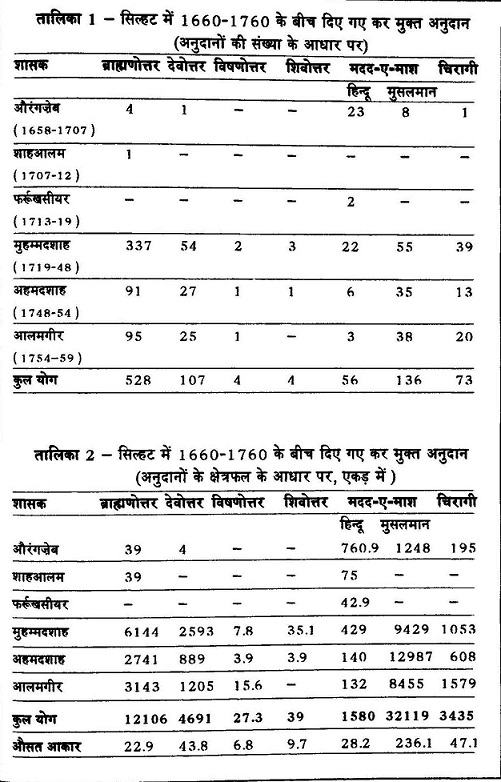 1660 के बाद से इस क्षेत्र में खेती के विकास के साफ सबूत मिलते हैं। आगे दी गई तालिका से यह पता चलता है कि 1660 से 1760 के बीच सिल्हट में फौजदार के दफ्तर से कितनी ज़मीन विभिन्न व्यक्तियों को अनुदाने में दी गई। हालांकि यहां के 26 फौजदारों में से सिर्फ एक हिन्दू था फिर भी यहां से दिए गए अनुदानों में हिन्दू संस्थाओं का हिस्सा काफी अच्छा था। वास्तव में ब्राह्मणों को उसकी ज्ञान व पवित्रता के लिए दिया जाने वाला ब्राह्मणोत्तर अनुदान सबसे बड़े किस्म का अनुदान था जिसमें प्रत्येक को औसतन 22.9 एकड़ जमीन मिलती थी।