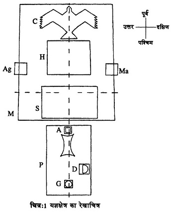 सोमयज्ञ के लिए कई सारे सा पण्डाल लगाने पड़ते हैं, जिनके लिए बहुत बड़ी जगह की ज़रूरत पड़ती है। इसके लिए कई सारी अग्नियों, चितियों, वेदियों और मण्डपों की जटिल व्यवस्था भी ज़रूरी होती है। अगले पेज पर याज्ञिक क्षेत्र का एक रेखाचित्र प्रस्तुत किया गया है। इसमें अनावश्यक संरचनाएं नहीं दर्शाई गई हैं। (देखिए चित्र-1)
