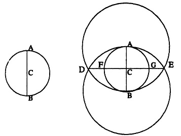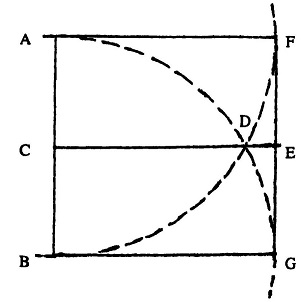 "AB एक, सरल रेखा है और C इसका मध्य बिंदु है। इस पर एक वर्ग बनाया जाना है। A व B बिन्दुओं से AB त्रि के दो चाप बिपरीत दिशाओं में खींचो। ये चाप परस्पर D बिंदु पर काटते हैं। बिंदु C व D को
