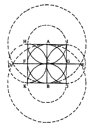 अब चार वृत्त खींचो जिनकी त्रिज्या CA के बराबर हो तथा केन्द्र बिंदु क्रमशः A, B, F व G। ये चार वृत्त बिंदु H, I, J व K पर एक-दूसरे को काटेंगे। H I, II, JK और KH को जोड़ दो। HIJK ही वांछित वर्ग है।" (चित्र-4)