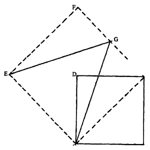 चित्र:5 चतुर्भुज को बराबर क्षेत्रफल के त्रिभुजों में बदलना। वर्ग का कर्ण AC खिंचों और AC को एक भुजा मानकर ACEF वर्ग बनाओ। अब वर्ग की भुजा FA का मध्य बिंदु ज्ञात करो। GC व GE को जोड़ो। GCE की वांछित समद्विबाहु त्रिभुज है।