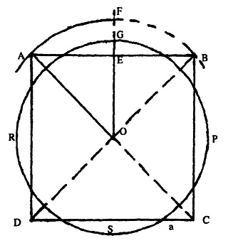 ABCD एक वर्ग है जिसकी भुजा a है। कर्ण AC खींचकर उसका मध्य बिंदु (O) ज्ञात कीजिए। अब 0 को केन्द्र तथा 0A को त्रिज्या मानकर चाप AB खींचिए। बिंदु E रेखा AB का मध्य बिंदु है। OE को जोड़ दीजिए और इसे F तक आगे बढ़ा दीजिए। EG=1/3 FE लेकर तथा 0 को केन्द्र व 0G त्रिज्या मानते हुए एक वृत्त GRSP खींचिए। यही वांछित वृत्त है। (चित्र-6)