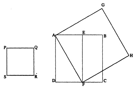 माना कि ABCD बड़ा और PQRS छोटा वर्ग है। PQ के बराबर AE और DF काटिए। बिन्दु E को F से तथा A को F से जोड़िए। वर्ग AGHF खींचिए। वर्ग AGHF क्षेत्रफल में ABCD व PQRS के क्षेत्रफल के योग के बराबर है।