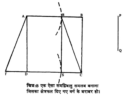 हम यहां प्रमेय 18 की चर्चा करेंगे। माना कि ABCD एक वर्ग है और समलम्बक की भुजा PQ दी गई है। PQ की लम्बाई AB से कम है। (देखिए चित्र-8)