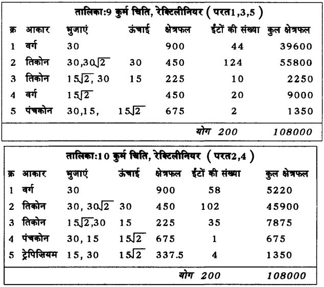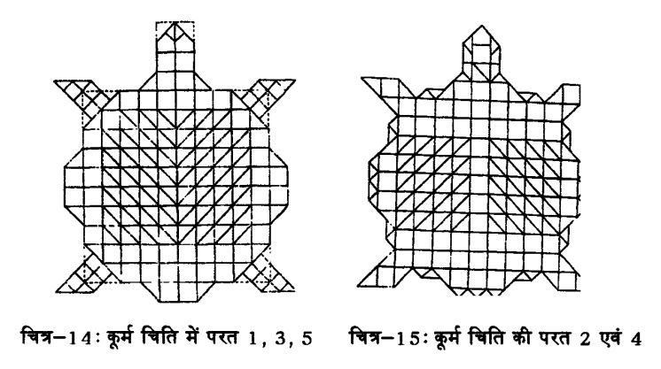 आइए कूर्म चिति को देखें। चतुर्भुजाकर कूर्म चिति तो कला का नमूना होती है। पक्षी आकार चिति की ही तरह इसकी कल्पना भी किसी ज्यामितिविद ने नहीं बल्कि ज्यामितिविद कलाकार ने की होगी। उसने अपने मन की आंखों से देखा होगा कि चतुर्थी ईंटों (30 x 30 वर्ग अंगुल क्षेत्रफल ) व उनके हिस्सों की एक निश्चित संख्या तथा एक हंसमुखी ईंट मिलकर हूबहू कछुए की छवि निर्मित कर सकेंगे। नीचे दिए गए चित्र तालिकाएं स्वयं पूरी कहानी कह देते हैं। चित्र 14 एवं 15 तथा तालिका 9 एवं 10 देखिए।
