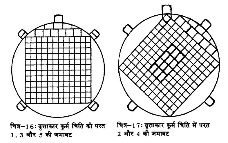 वृत्ताकार कूर्म चिति में इतनी सुन्दरता नहीं होती। किन्तु इसमें भी कुछ हुनर अवश्य लगता है। इसमें भी विधि वही होती है जो वृत्ताकार द्रोण चिति में प्रयुक्त की गई थी। किन्तु एक बृहति (चतुर्थी) ईंट छोड़ने की बजाए हम पांच ऐसी ईंटों को बाहर छोड़ देते हैं और उन्हें 10 (5x2) भागों में बांटते हैं। इन ईंटों को हटाने के बाद जो वर्ग बचता है उसका क्षेत्रफल 103,500 वर्ग अंगुल (108,000-900 x 5 वर्ग अंगुल) होता है। इसे वृत्त में तब्दील किया जाता है। इस वृत्त के अन्दर बन सकने वाला बड़ा-से-बड़ा वर्ग बनाकर उसे 144 बराबर वर्गों में बांटा जाता है। चित्र 16 को देखिए।