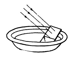 एक थालीनुमा बर्तन को पानी से भर लीजिए। अब बर्तन को किसी ऐसी जगह रखिए जहां सूरज की रोशनी इस तक पहुंच रही हो। चित्र में दिखाए अनुसार बर्तन के किनारे से टिकाकर एक आईना रखिए। आईने का चमकदार हिस्सा ऊपर की ओर व सूरज की तरफ होना चाहिए। अब आईने को इस तरह सेट करना है कि सूरज का प्रतिबिम्ब पास की किसी दीवार पर बने। |